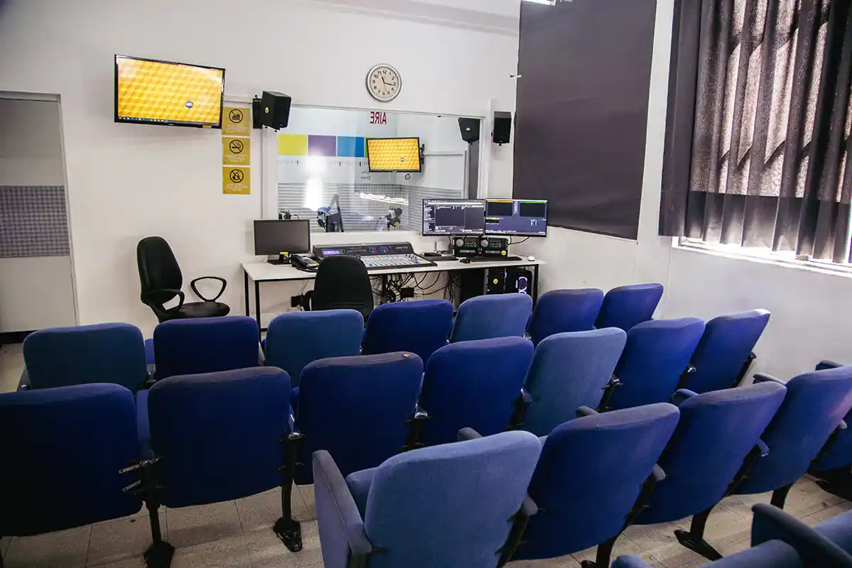 Nuestros estudios están equipados con consolas Solidyne y DBA, acustización ignífuga y programas de automatización de radio preparados para trabajar el formato de Streaming. Además contamos con cámaras que cubren distintos ángulos de los conductores para replicar el formato de transmisión digital. Aquí nuestros alumnos dan rienda suelta a su creatividad y exploran las infinitas posibilidades de la comunicación.